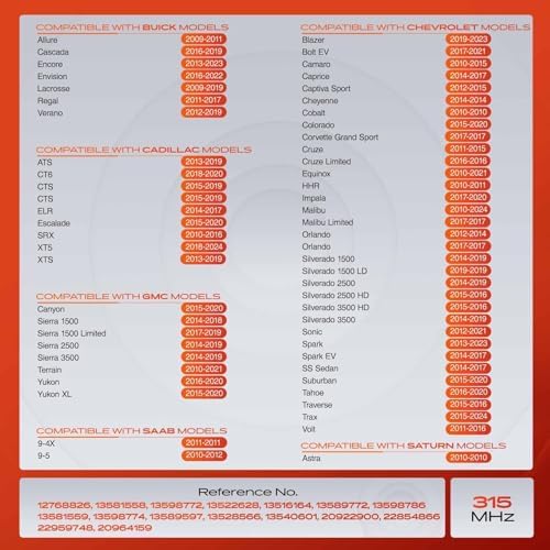 [Vehicle Fitment-2]: Compatible with Buick Allure, Cascada, Encore, Envision, Lacrosse, Regal, Verano; Compatible with Cadillac ATS, XTS, CT6, CTS, ELR, Escalade, SRX, XT5, XTS; Compatible with GMC Canyon, Sierra 1500, Sierra 2500, Sierra 3500, Terrain, Yukon, Yukon XL; Compatible with Saab 9-4X, 9-5; Compatible with Saturn Astra
