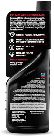 Techron High Mileage Fuel System Cleaner is specially formulated to clean and protect classic cars and all vehicles with over 75, 000 miles. It is formulated for gasoline powered, modern and classic, passenger cars, light trucks, and SUVs, including carbureted, two stroke, and port fuel injected engines. To keep the entire fuel system clean, use Techron High Mileage every 1, 000 miles or as needed for your high mileage vehicle. 1 One 12oz bottle treats up to 21 gallons of gasoline. Recommended for use in: Spark ignition engines with gasoline, ethanol and gasoline/ethanol blends Gasoline hybrid vehicles. Will not harm catalytic converters and oxygen sensors. Not recommended for diesel engines. Not for aviation.