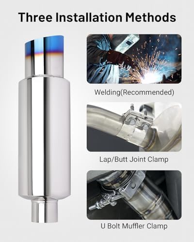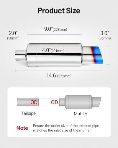 Size and Construction:This muffler is having 2″ inlet,3″ exit,14.6″ length,polished stainless steel;It is universal,Please measure your car’s inlet before purchasing