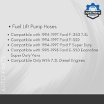 KFL-33 – Connects fuel pressure regulator to the fuel tank return line. The fuel pressure regulator is located on the driver side of the fuel filter housing. Black hose measuring approximately 1.50 inches. Includes (2) hose clamps, replaces OEM part number F4TZ-9324-BA . KFL-34 – Connects the passenger side top fuel pump port to the fuel filter housing. Blue hose measuring approximately 3.25 inches. Includes (2) hose clamps, replaces OE part number F4TZ-9324-CA. KFL-35: Connects the driver side top fuel pump port to the fuel tank hard-line and the fuel pump lower port to the fuel filter housing. Sold as a set of (2) hoses with . Blue hose measuring approximately 2.12 inches, replaces Motorcraft part number F4TZ-9324-DA . KFL-32 : Bypass hose, connects fuel pressure regulator to the bottom of the fuel filter housing on 1994 and 1995 model year engines; not used on later style filter housings. Includes (2) hose clamps. Blue hose measuring approximately 6.50 inches, replaces Ford part number F4TZ-9324-AA F5TZ-9C024-A. – (bypass hose) is applicable for 1994.5 – 1995 Ford F-Series and E-Series only; not used on later style fuel filter housings. We highly recommend replacing these hoses anytime the fuel filter housing is removed for service or a leak is detected. All listed products are identical to the OEM Ford hoses.