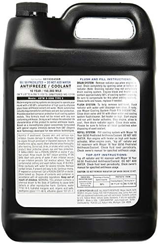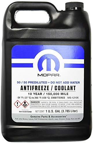 Mopar 50/50 prediluted antifreeze/coolant 10-year/ 150,000 mile. Do not add water. Contains 50% Ethylene glycol based formulation with a bittering agent to prevent freeze-up and boil-over while inhibiting corrosion. Must not be mixed with any non-conforming antifreeze. OAT (Organic Acid Technology). Developed for new vehicle technologies. This item contains a bittering agent.
