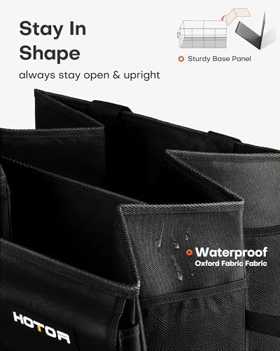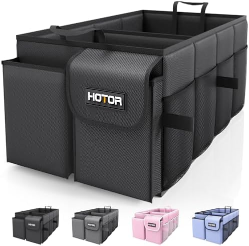 CONVENIENT ACCESS: HOTOR car trunk organizer for SUV is equipped with 2 compartments and 6 stretchy mesh pockets to make items easy to see and grab when needed. No more digging around a messy trunk to find what you need. Just grab and go.