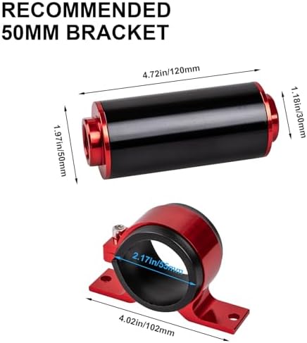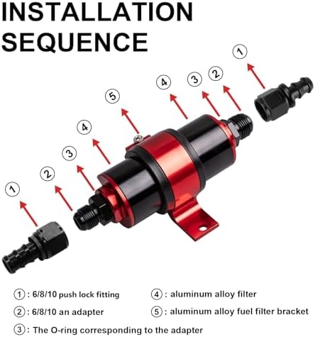 Package Include: Our in line fuel filter package includes one 100 micron fuel filter, two each of 6 an, 8 an, 10 an adapters, six O-rings and one 50 mm mounting bracket