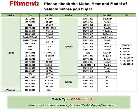 Application: Marsflex tire sensors are compatible for Lexus CT series, ES series, GS series, GX series, HS series, IS series, LFA, LS, LX, RX, SC| for Scion iQ, tC, xB, xD| for Pontiac Vibe
