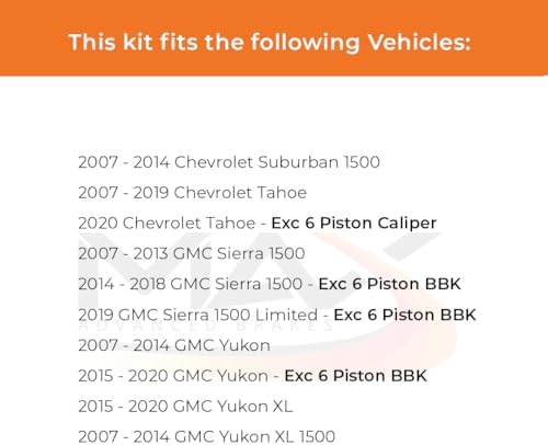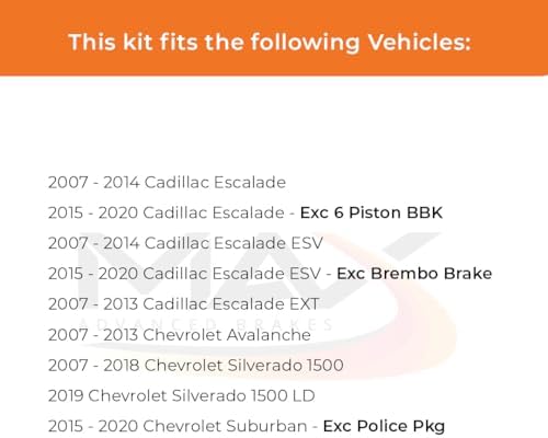 Precise Vehicle Compatibility: This brake pad and rotor kit is compatible with 2007-2018 Chevrolet Silverado 1500, 2015-2020 Suburban Exc Police Pkg, 2007-2014 Suburban 1500, 2007-2013 Avalanche, 2007-2019 Tahoe, 2020 Tahoe Exc 6 Piston Caliper, compatible with 2007-2013 GMC Sierra 1500, 2014-2018 Sierra 1500 Exc 6 Piston BBK, 2007-2014 Yukon, 2015-2020 Yukon Exc 6 Piston, compatible with 2007-2014 Cadillac Escalade, 2015-2020 Escalade Exc 6 Piston, 2007-2020 Escalade ESV, 2007-2013 Escalade EXT