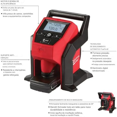 features & benefits: top off a car Tire in under 1 minutes 28-35 PSI, fills a lt Truck Tire in under 4 minutes 30-45 PSI. redlink™ intelligence: truefill™ auto shut-off technology increases accuracy, protects from over-temp and over-fill. high efficiency pump and motor for true 120 PSI capability. illuminated digital gauge with target and current pressure reading. The milwaukee® m12™ compact inflator delivers fast, accurate, easy inflation with the portability to take anywhere. The inflator has the capability to complete demanding applications like car, lt Truck, and compact equipment tires, the m12™ compact inflator gives users ultimate power and efficiency. Rated to deliver over 120PSI, the high efficiency motor and pump top-off car tires in under 1 minute. The truefill™ auto shut-off technology delivers highly accurate pressure, protects from overfill, and automatically senses speed of fill to deliver precise shut-off at the desired PSI. Additionally, the unit includes a large easy to read back-lit LCD, Anti-Vibration feet, and 26” inch hose with an all brass Schrader chuck. ≪ br/>