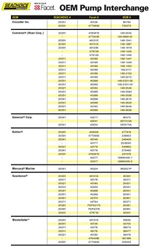 This Seachoice Dura-Lift® Electronic Fuel Pump features premium components and solid-state construction to ensure it provides the most reliable fuel delivery possible. It offers tremendous versatility as it is compatible with gasoline, diesel, biodiesel, blended alcohol fuels, and fuel additives, so it will work for the widest variety of applications. Plus, this 12-volt Fuel Pump can be used on: marine generator sets, refrigeration trucks, diesel filtration systems, industrial applications, and other diesel lift applications. It is rated for 120 inches lift, 11.5-9 psi, and 33 gph. This OEM # FACET 40222 Fuel Pump has a 1/8 inch x 27 thread. This Fuel Pump is self-regulating and has an internal check valve. It also has a 4-hour dry run, voltage spike protection, and an 80-micron Stainless Steel filter to prevent impurities from passing through the fuel system. Seachoice is committed to delivering quality marine accessories and OEM replacement parts to satisfy fishing, boating and watersports enthusiasts worldwide. Seachoice is run for and by boaters, offering a wide-ranging product line while remaining affordable.