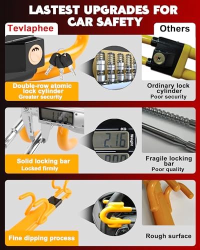 HIGHLY VISUAL DETERRENT AND SAFE:The bright color of the car lock is a fine choice for maximum visibility both day and night,which tells the thief “Not this car”!The anti car theft device greatly reduces the possibility of being targeted by thieves and protects your car security effectively.Tevlaphee steering wheel lock gives you more peace of mind!