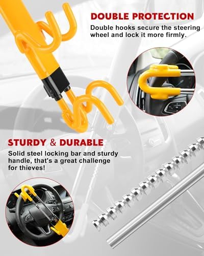 A+ GRADE ANTI-THEFT LOCK:Car wheel lock is made of top-grade steel, featuring a high-strength solid locking beam that makes it difficult for thieves to break. The pure copper lock core is durable and provides secure anti-theft protection! The precise double spring crescent lock sub-type encoding key is specially designed to prevent professional thieves and mutual open rate!The overall body of the anti-theft steering wheel lock is treated with a plastic dipping process that will not damage you steering wheel